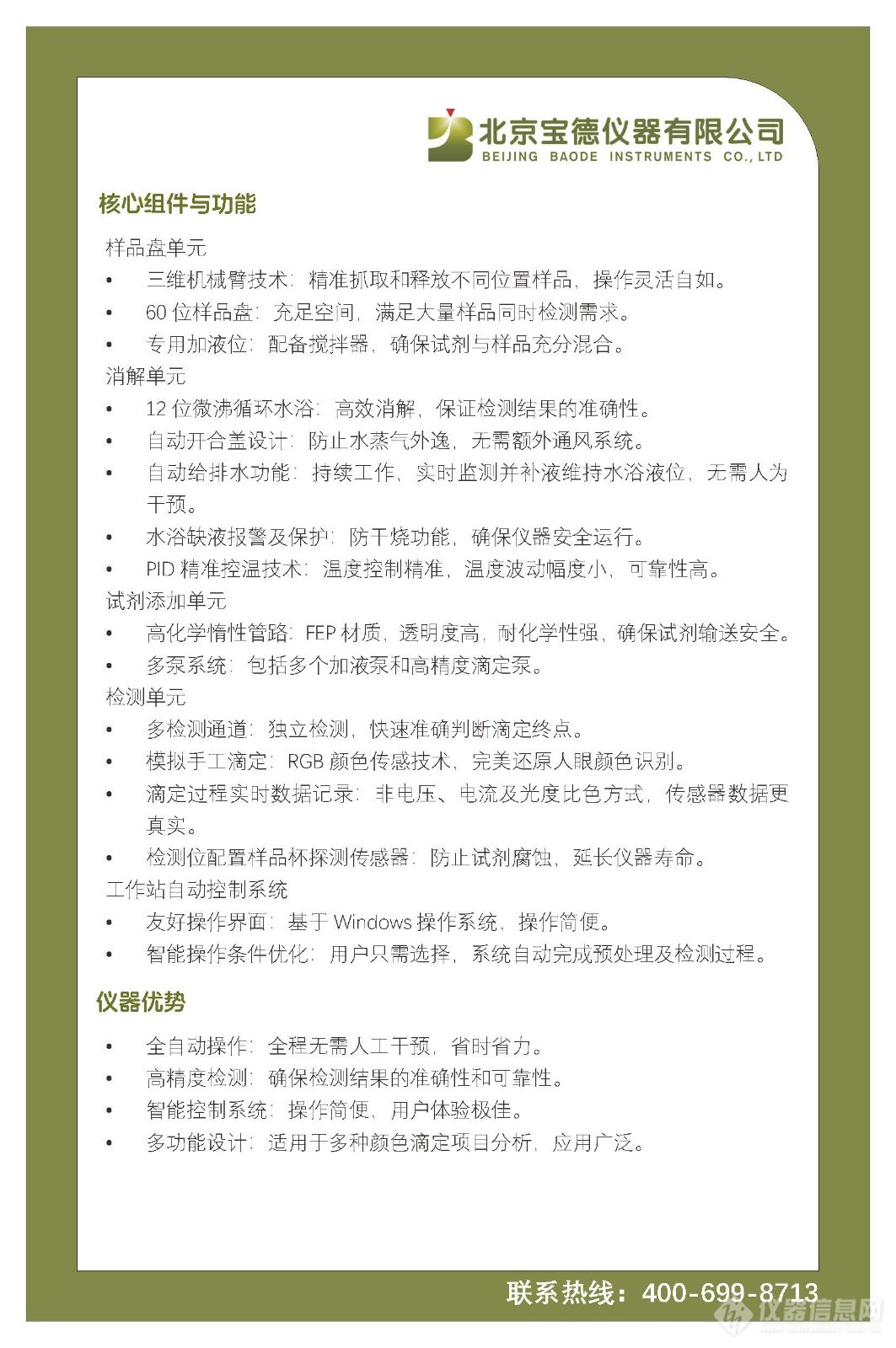 BCOD-60A全自动高锰酸盐指数分析仪,是北京宝德仪器有限公司自行研发且具有自主知识产权的分析仪,采用的分析方法完全符合GB11892-89、GB/T 5750.7-2023、GB/T 5750.4-2023、GB/T13025.7-2012标准方法的规定。仪器自动化程度高、操作简便,相互独立的多个检测通道可同时检测(也可灵活设定单通道检测),极大提高了整体分析效率、时效性和准确度。同时仪器可自动精准判定滴定时间、温度和滴定终点,节省人力和时间成本的同时,检测精度大幅提高,在大批量水质样品的分析测试方面极具优越性,广泛受到了环境、疾控、水利、水文等行业用户的认可和青睐。